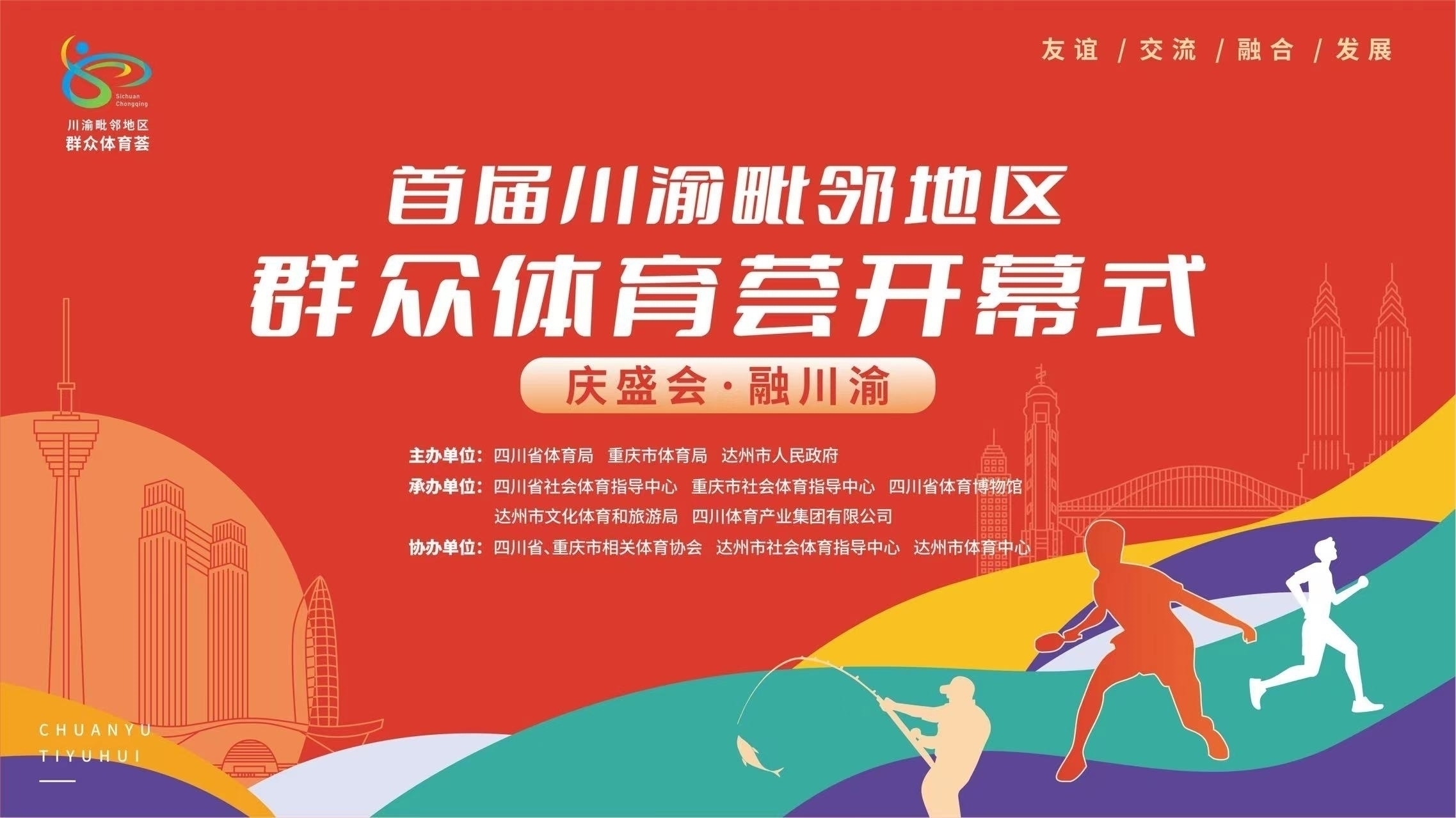 “庆盛会·融川渝——首届川渝毗邻地区群众体育荟”将于11月3日-6日在达州市举办。本次活动由四川省体育局、重庆市体育局、达州市人民政府共同主办,四川省社会体育指导中心、重庆市社会体育指导中心、四川省体育博物馆、达州市文化体育和旅游局、四川体育产业集团有限公司承办,是党的二十大后川渝毗邻地区举办的规模最大、规格最高、普及率最广、影响力最强的群众体育盛会。